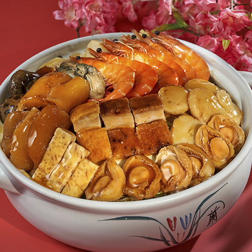 Braised 8-Head Abalone with Sea Cucumber, Live Prawn, Fresh Scallop, Dried Oyster, Roasted Sliced Duck, Braised Pork Belly, Yam, Mushroom, Tientsin Cabbage, Radish, Cloud Fungus, and “Fa Cai”