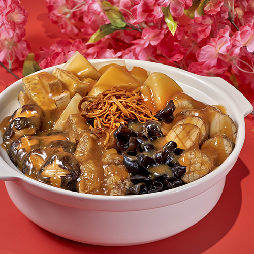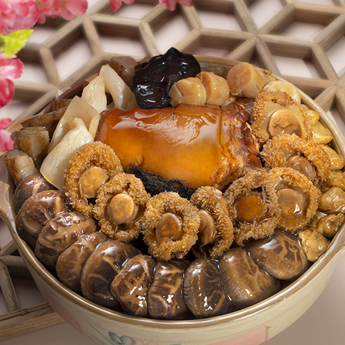 Braised 5-Head Abalone with Pig’s Trotter, Dried Oyster, Sea Cucumber, Fish Maw, Conpoy, Duck Web, Mushroom, Tientsin Cabbage, Radish, and “Fa Cai”