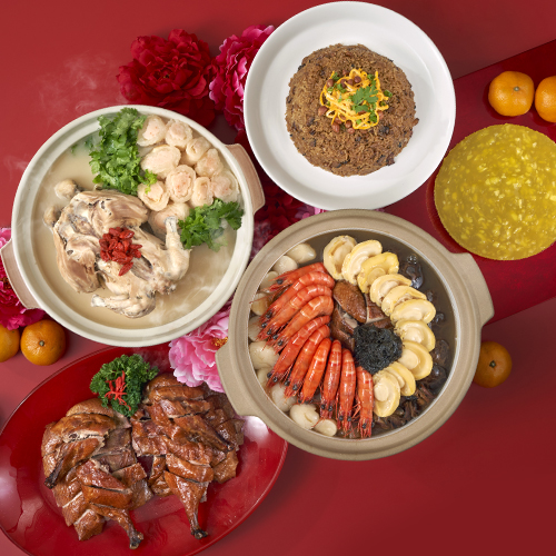 Jia He Grand Treasures Pen Cai, Roasted Crispy Duck (Half), Stir-fried Glutinous Rice with Chinese Sausage, Chilled Water Chestnut Pudding